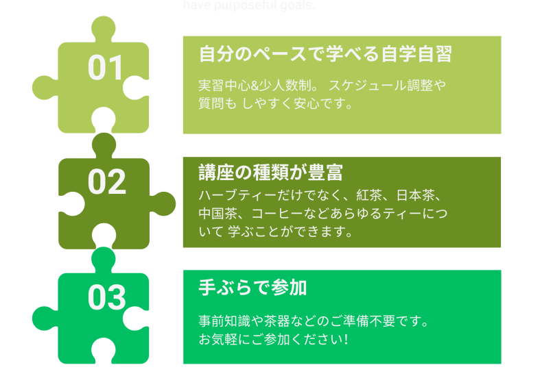 2005年10月創立以降、専門的な知識をもとにお茶の愉しい飲み方、健康・美容・グルメの観点からアドバイスできる人々を増やし、社会に貢献することを目指しています。